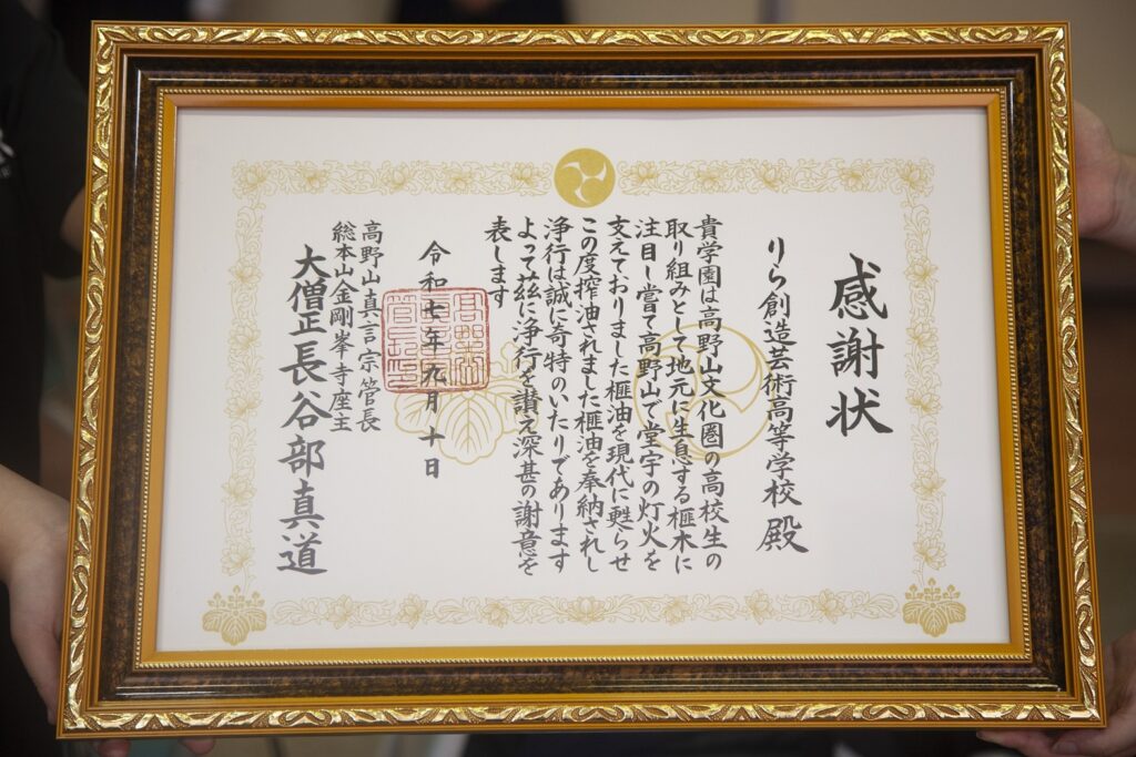 そして、地元に生息する榧木から、かつて灯明として高野山を支えた油を現代によみがえらせたことを讃えていただく手書きの感謝状もいただきました。