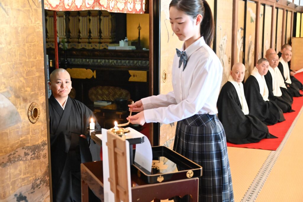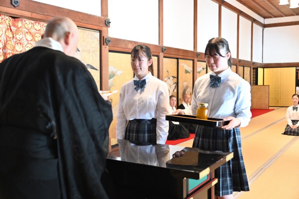 奉納後の金剛峯寺の桐生執行様からのごあいさつで、高校生がお太師様の時代から続く灯明の榧油に着目し取り組んでいることを評価していただき「これからも、高野山文化圏の活性化に励んでほしい」というお言葉をいただきました。